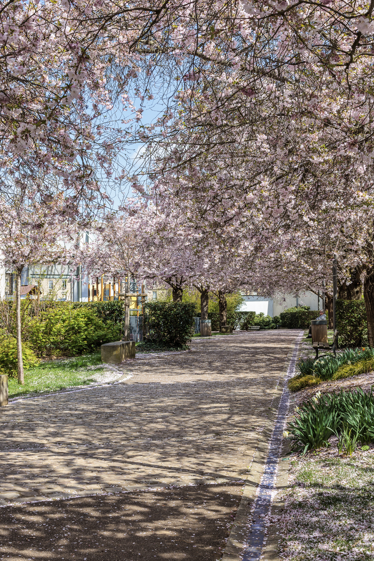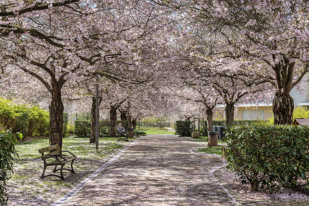 Au printemps, les cerisiers en fleurs transforment l’allée centrale en un tunnel de pétales roses et blancs. C’est un lieu qui respire la tranquillité, un espace où l’on peut s’asseoir sur un banc, lire, discuter ou simplement observer.