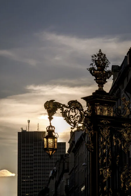 Cette photographie a été prise à Nancy, sur la célèbre place Stanislas, en fin de journée, alors que le soleil couchant habille la ville d'une lumière chaude et dorée. Au premier plan, une lanterne richement ornée, partie intégrante des grilles en fer forgé signées Jean Lamour, capte les derniers rayons de lumière. Le détail de ses motifs dorés contraste avec la silhouette massive et rectiligne de la tour Thiers à l’arrière-plan, emblème de l’architecture moderne des années 70.